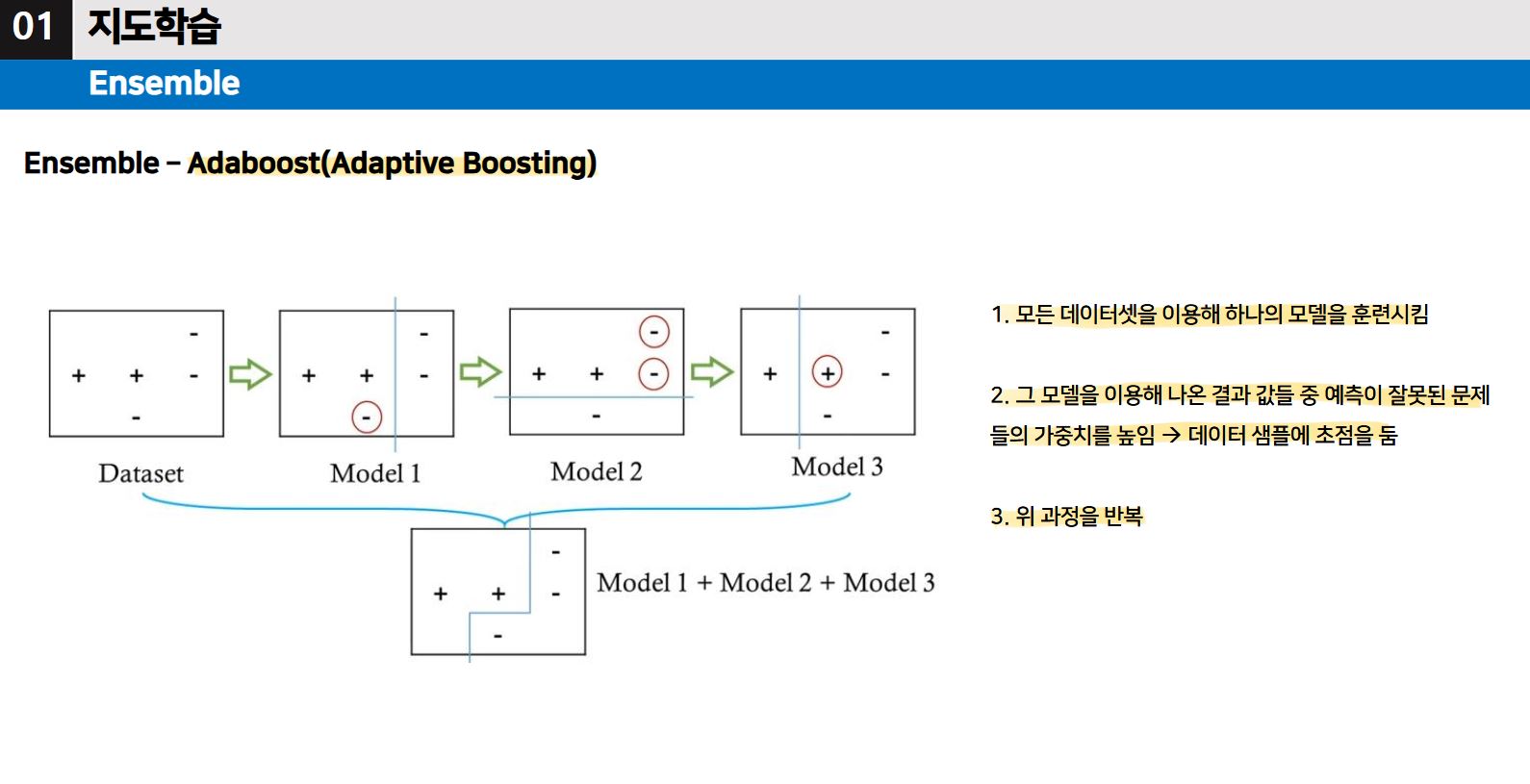 - 전체 데이터를 학습했을 때, 정답과 거리가 멀었던 문제들에 대해 높은 가중치를 부여하고 정답이었던 문제들에 대해서는 낮은 가중치를 부여해 새로운 모델을 다시 학습시킨다.