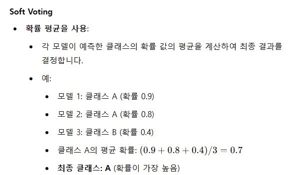 - Soft Voting : 각 모델이 예측한 클래스의 확률 평균을 사용