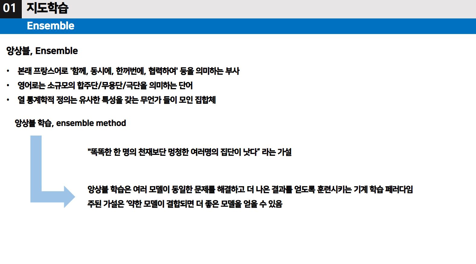 ▶이번 시간엔 앙상블이다. 여기서는 수업때 듣기로(?) 느낌으로, booting? voting? 그 개념만 확실히 잡으면 된다. 차차 같이 보자.