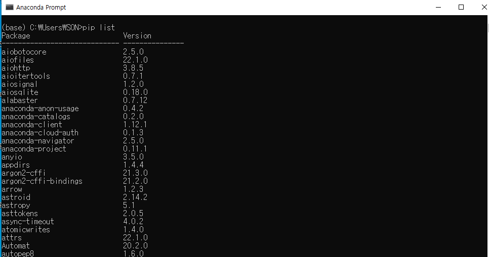 pip list : 현재 내 컴퓨터에 설치된 파이썬 라이브러리 목록을 출력 >> 판다스가 잘 설치되었는지 확인
