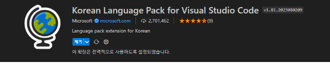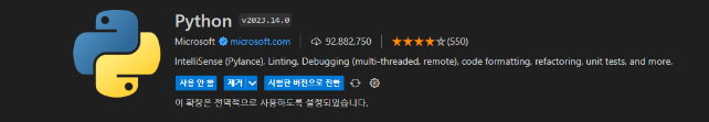 빨간색 박스를 클릭 후 검색창에 'Python' 과 한글화를 위하여 'Korean Language Pack for Visual Studio Code'을 입력한 후 설치해 주자.