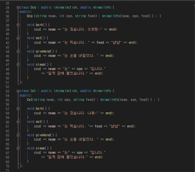 3. 원하는 동물로 클래스 만들고, 1, 2 인터페이스와 클래스를 다중 상속 받아