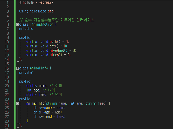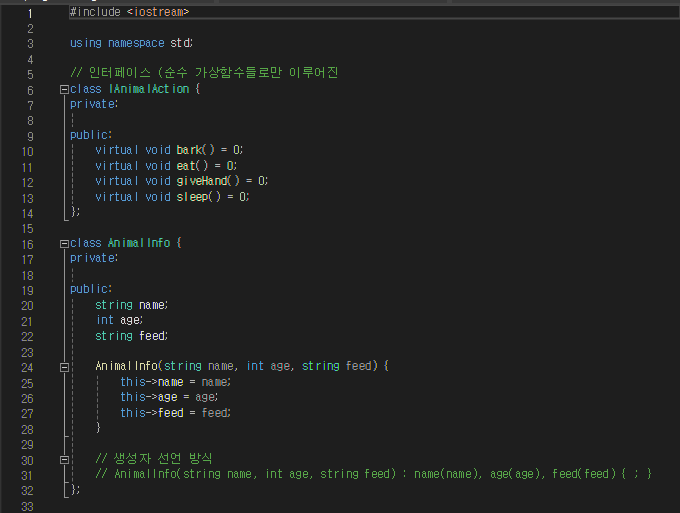 | 2024.01.31 C++ 언어 공부 6일 차 (동적 바인딩, 가상 함수, 인터페이스) (0) | 2024.02.01 |