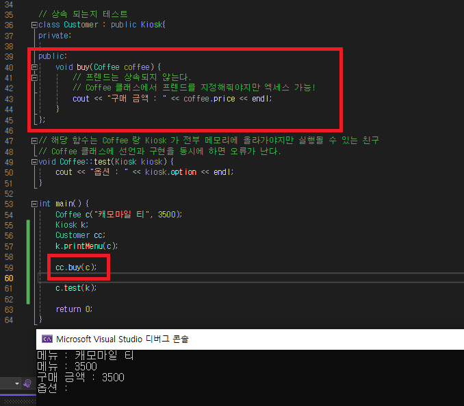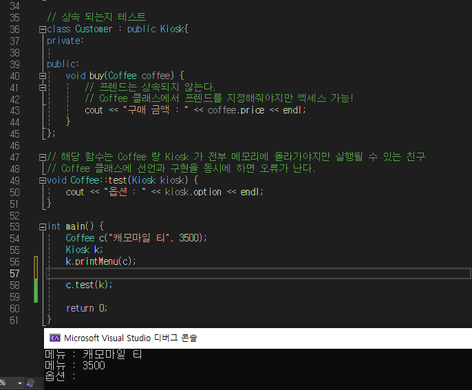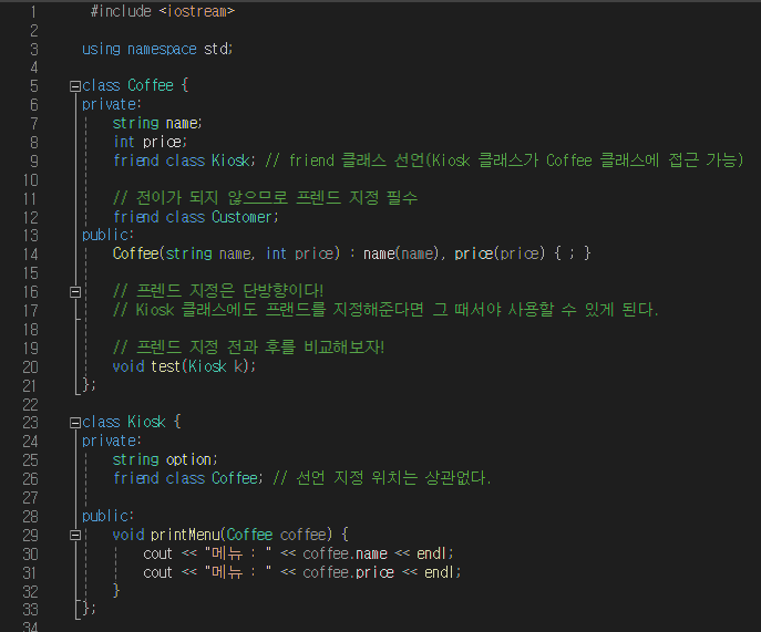 프렌드 지정은 단방향이다! Kiosk 클래스에도 프랜드를 지정해준다면 그 때서야 사용할 수 있게 된다.