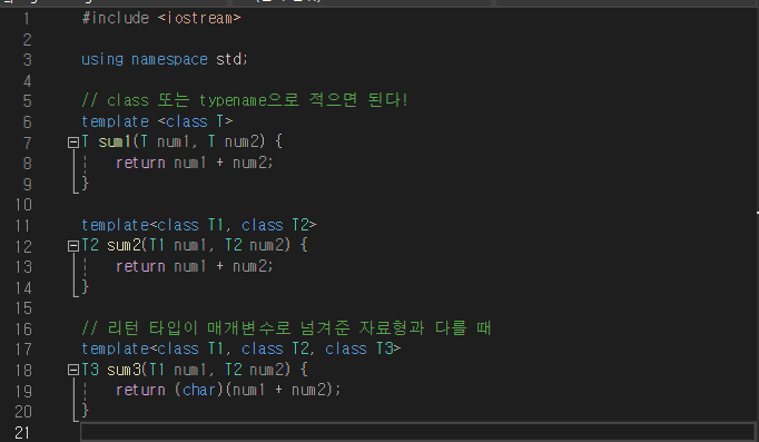 - 사용 방법은 원하는 함수나 클래스 위에 템플릿을 사용할 것을 적어두면 된다.