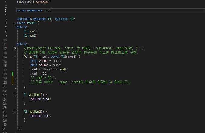 T& : 전달된 인자를 참조로 받기 위해 사용한다. 복사를 하는 대신 참조를 통해 원본 객체에 직접 접근할 수 있게 된다.