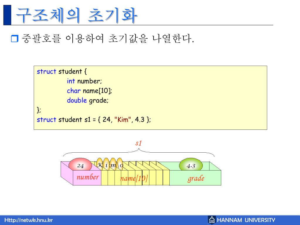 ※ 각 멤버들의 공간이 메모리에 연속으로 할당되며 모든 멤버를 더한 전체 공간이 하나의 구조체 변수가 되므로 변수의 크기는 각 멤버의 크기를 더한 값이 됩니다.