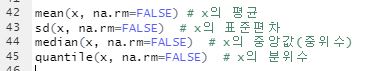 median(x, na.rm=FALSE) : x의 중앙값(중위수)