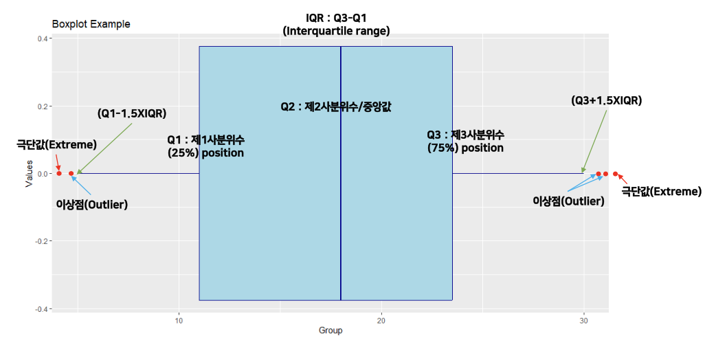 - → 극단치, 이상치 확인이 빠르다. 극단값은 데이터 세트에 해치지 않기 때문에 데이터를 오염시킨다는 근거가 명확히 없는 한 유지하고 이상치는 제거한다.