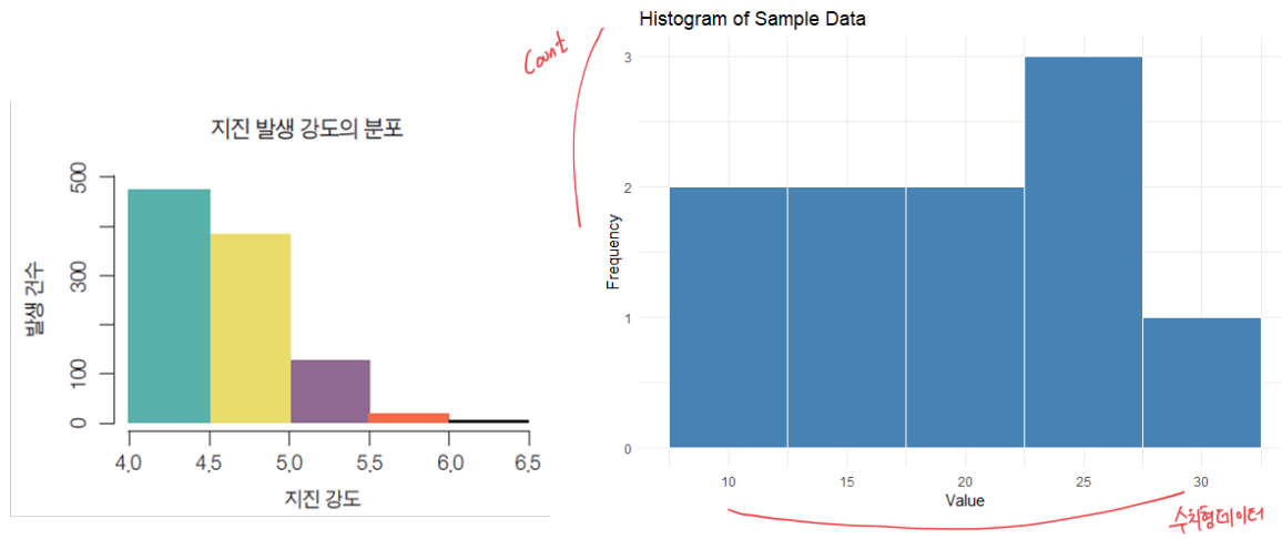 - → X좌표는 수치형 데이터이고, Y좌표는 Count, Frequency 빈도를 나타낸다.