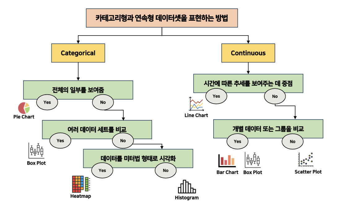 - 히트맵(Heatmap) : 데이터를 색상의 변화를 표현하고, 복잡한 데이터의 패턴, 변화량, 밀도 등을 한 눈에 파악하기에 유용하다.