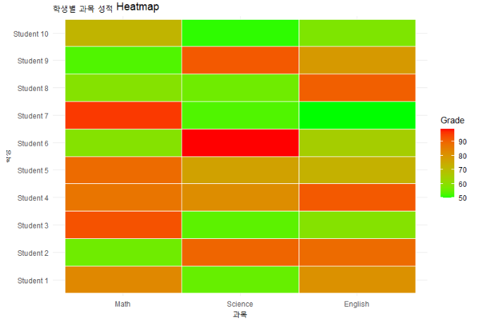 - 히트맵(Heatmap) : 데이터를 색상의 변화를 표현하고, 복잡한 데이터의 패턴, 변화량, 밀도 등을 한 눈에 파악하기에 유용하다.