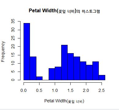 ▶ 연습3. R 기본 패키지에 있는 ‘iris’ 데이터셋에서 Petal.Width(꽃잎 너비)의 히스토그램을 작성하시오. hist(iris$Petal.Width, main = "Petal Width(꽃잎 너비)의 히스토그램", # 그래프 제목