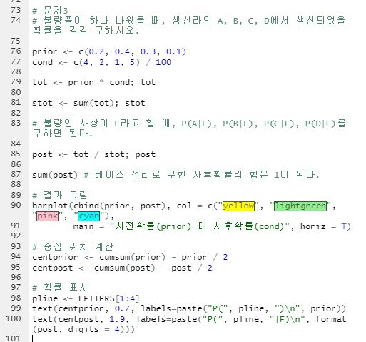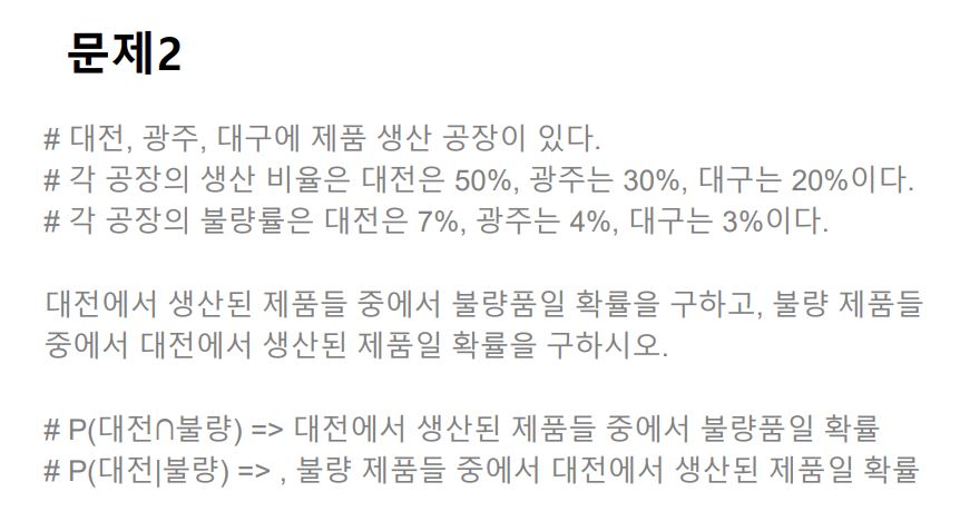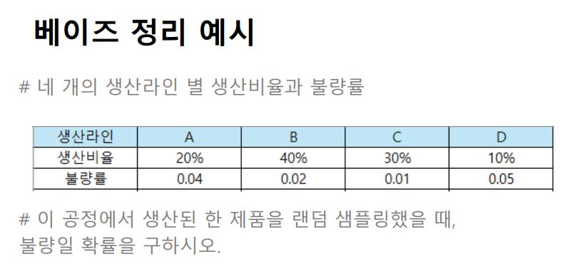 + 사상 A와 D의 사후 확률은 늘어났지만, 사상 B와 C의 사후확률은 줄어들었다. 이는 생산라인 A와 D의 불량률이 상대적으로 높았고, 생산라인 B와 C의 불량률은 상대적으로 낮았기 때문이다.