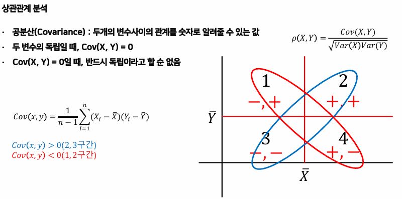 - 공분산(Covariance) : 두 개의 변수 사이의 관계를 숫자로 알려줄 수 있는 값