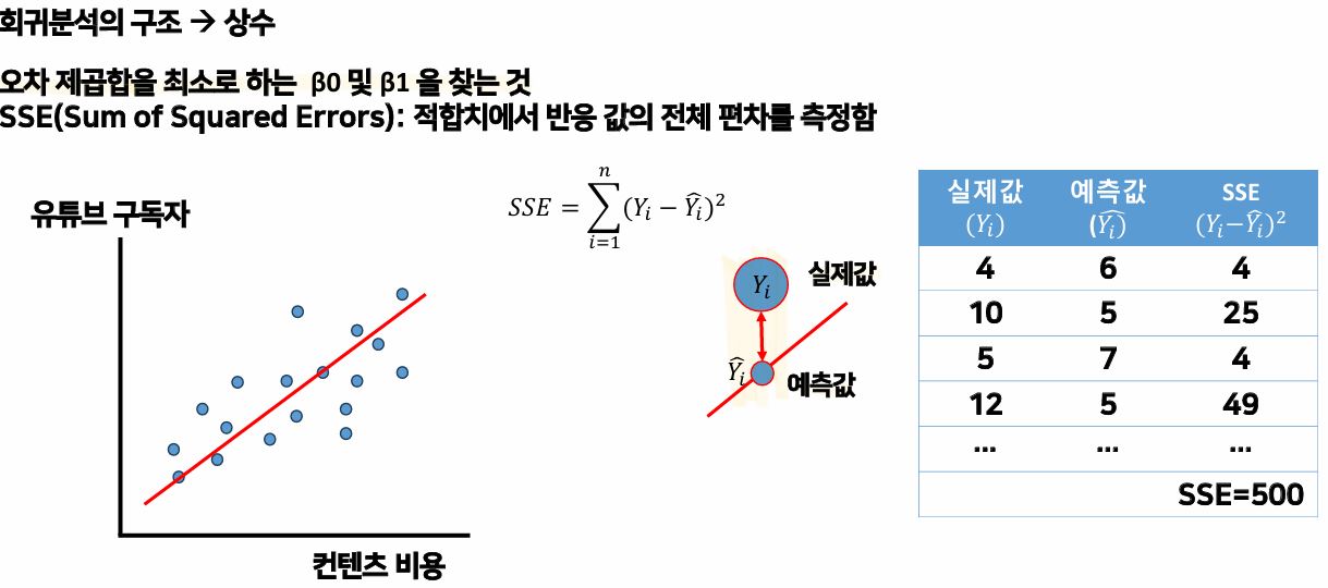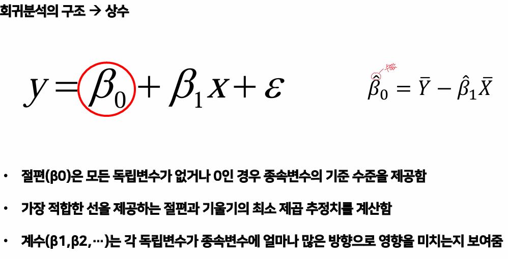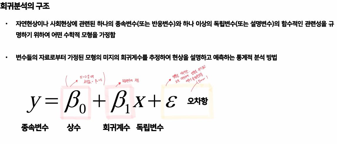 회귀분석은 변수들의 자료로부터 가정된 모형의 미지의 회귀계수를 추정하여 현상을 설명하고 예측하는 통계적 분석 방법이다. 이때 여기서, y는 종속변수 (예측값)이며, 베타 0은 x가 0일때의 초기값 (+오차항)이다. 베타 1은 독립변수의 지분이고, 오차항은 영향은 가지만 전체 데이터에게 영향은 미치지 않으며 예측이 불가능한 것들이다. (잔차)