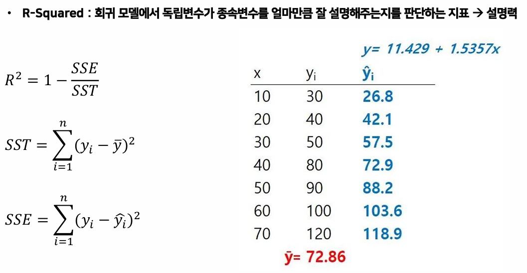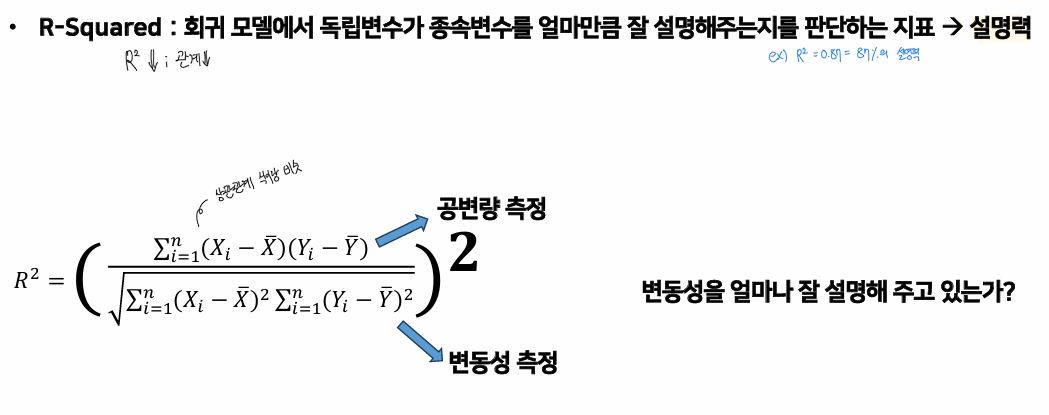 R-Square : 상관계수의 제곱값으로, 독립변수에 의해 설명되는 종속변수의 분산 비율이다.