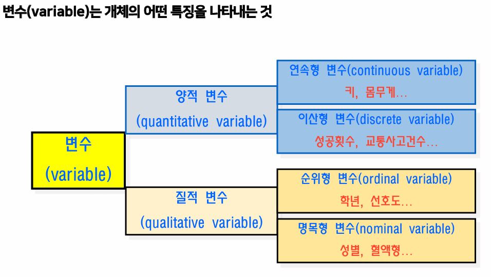 - 변수 : 변수는 주어진 상황에서 다양하거나 다른 값을 가질 수 있는 특성, 속성 또는 수량을 나타냄