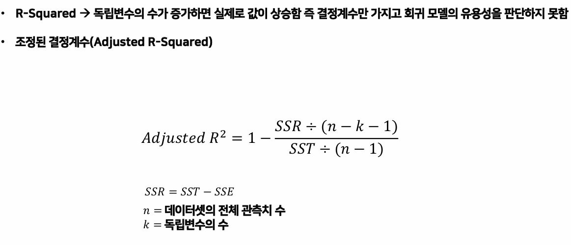 R-Squared → 독립변수의 수가 증가하면 실제로 값이 상승한다. 즉 결정계수 R-Squared만 가지고 회귀 모델의 유용성을 판단하지 못하므로, 조정된 결정계수인 Adjusted R-Squared까지 같이 보아야 한다.