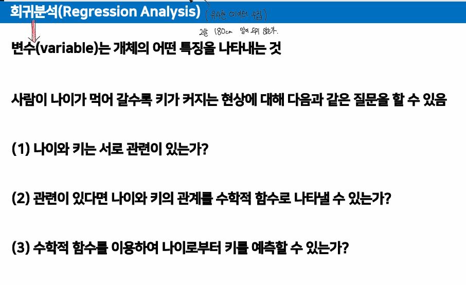 회귀분석은 유사한 데이터를 수집한다. 여기서의 변수는 개체의 어떤 특징을 나타내는 것이다.