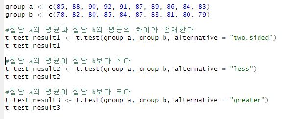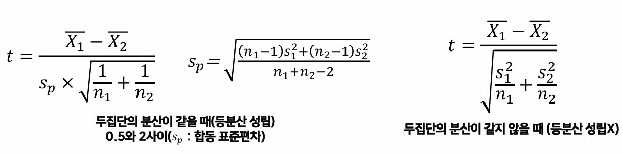 - 정규성 : 비교되는 두 그룹 각각의 데이터는 대략 정규 분포를 따라야 함 & 무작위로 샘플링이 가능해야 함