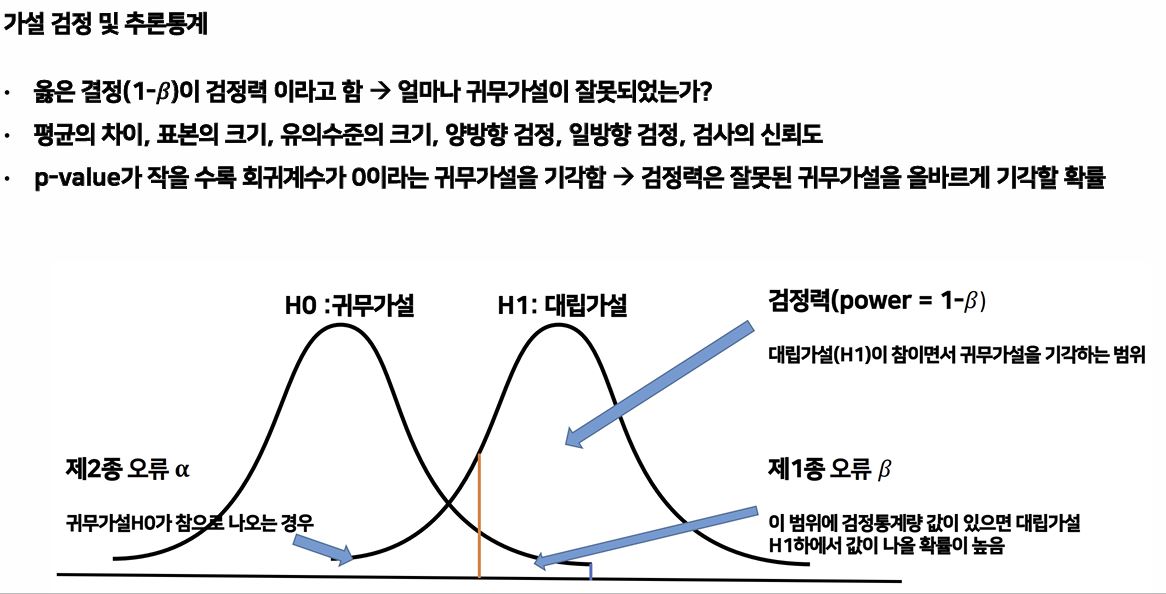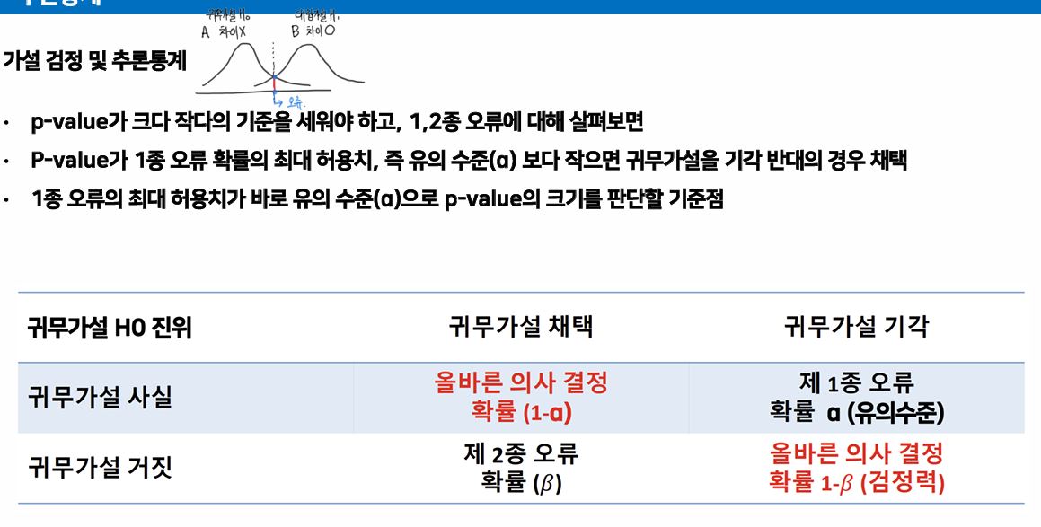 ※ 유의수준은 0.10, 0.05, 0.01 중으로, 연구자가 설정하는 것이지만 유의수준보다 p-value가 작으면 귀무가설을 기각하고, 반대의 경우에는 귀무가설을 채택한다.