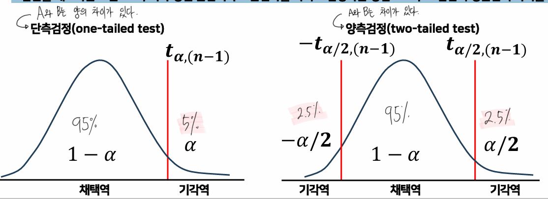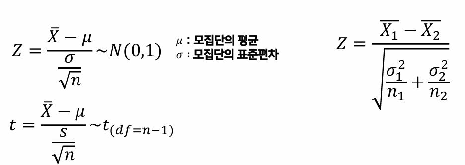 - 표본의 변동성을 고려하여 표본 평균과 가설 평균의 차이(또는 쌍 표본 간의 차이)를 비교