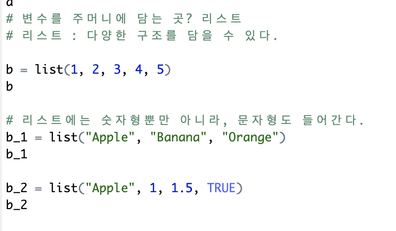 선형구조-리스트데이터 유형을 저장하고, 저장된 데이터들을 그룹화할 수 있는 데이터 구조숫자, 문자, 논리값 ... 등등 다양한 데이터 유형의 요소가 포함될 수 있다. 각각의 다른 데이터 형태를 모두 묶어서 그룹화할 수 있다. 물리에서 벡터란 ?크기와 방향을 갖는 물리량벡터는 사물의 움직임을 프로그래밍하기 위한 가장 기본적인 구성요소 프로그램에서 벡터란 ?값을 저장하고, 조작할 수 있는 기본 데이터 구조숫자, 문자 또는 논리 값과 같은 동일한 데이터 유형의 요소를 보유할 수 있는 1차원 배열R의 벡터는 combine을 나타내는 c(  )함수를 사용하여 만들 수 있다. 리스트자료를 순서대로 한 줄로 저장하는 자료구조여러 자료가 일직선으로 서로 연결된 선형 구조배열단일 타입으로 구성되는 자료구조대규모 다차원 ..