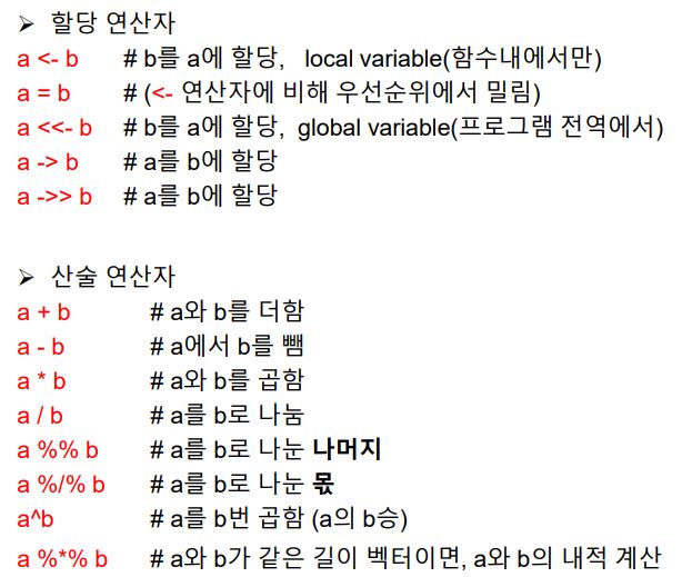 데이터 유형별 우선순위 : 논리형 < 정수형 ~ 요인형 < 실수형 < 복소수형 < 문자형 [ 자료구조 ] 벡터(vector) : 동일한 데이터 유형으로 구성된 데이터 집합 행렬(matrix) : 동일한 종류로 구성된 2차원 데이터 집합 배열(array) : 동일한 데이터 종류로 구성된 2차원 이상의 구조 데이터프레임(data frame) : 각 열마다 같은 길이의 벡터를 가짐 리스트(list) : 여러 유형의 변수를 자유롭게 결합한 구조 → 벡터, 행렬, 배열, 데이터프레임을 원소로 갖는 리스트