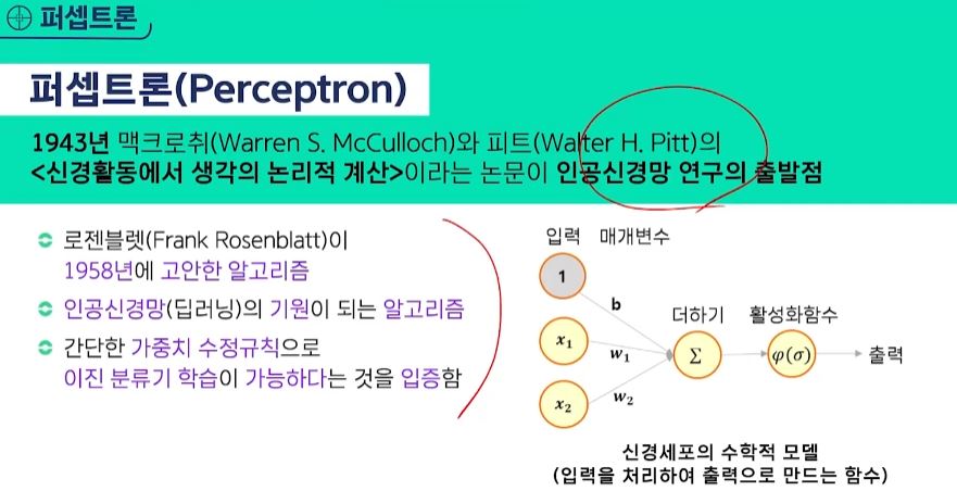 [학습목표]인공신경망 알고리즘에 대해 설명할 수 있다.퍼셉트론퍼셉트론이라고 하는 것은, 1943년 맥크로취와 피트에 의해서 신경활동에서 생각의 논리적 계산이라고 하는 논문에서 처음으로 인공 신경망의 연구가 출발이 되었고 이러한 인공 신경망 출발을 하고 난 이후에 그로부터 한 10년 뒤, 로젠블렛에 의해 고안된 알고리즘이 바로 퍼셉트론이다. 이러한 알고리즘은 가중치 수정규칙으로 이진 분류기 학습이 가능하다고 하는 부분도 입증되었다.인공신경망의 기원이 되는 알고리즘퍼셉트론은 최초의 인공 신경망이고 단층 신경망으로써 선형 분류의 문제를 해결할 수 있다. 근데 문제가 발생했다. 퍼셉트론만으로는, 비선형적인 문제를 풀 수가 없다는 문제에 봉착하게 되었다. 퍼셉트론이 나오면서 첫 번째 인공지능에 관련된 황금기가 시..