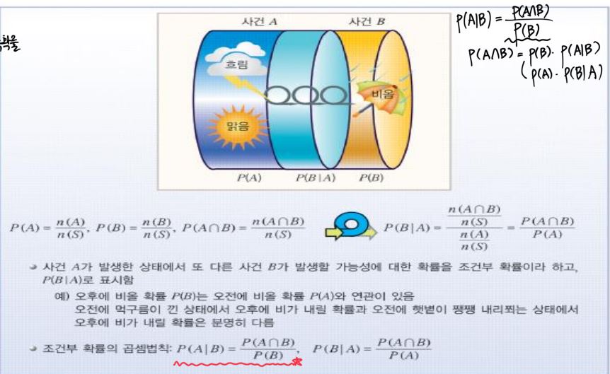 결합확률 : 확률변수가 2개 인 경우에 정의되는 확률이고, 확률변수가 취할 수 있는 모든 경우에 대한 빈도, 또는 이것으로부터 동일하게 확률로 변환하면 된다. 빈도로 표현하거나 확률로 동일하게 표현하면 된다. 한계확률 : 변수가 2개인 상황에서 한 개만을 확률변수로 취급하는 것 조건부 확률 : 여전히 2개가 확률변수이다. 문제에서, 불량 제품이라는 조건 하에서 대전에서 생산된 제품일 확률을 구하시오. 가 나오면 P(불량) = P(대전∩불량) + P(광주∩불량) + P(대구∩불량) = 0.053 P(대전|불량) = P(대전∩불량) * P(불량) = 0.035 / 0.053 = 0.6603 각각 구분 할 줄 알아야 한다. 독립은 복원추출이다, 영향을 주지 않는다. 이항분포 종속은 비복원추출이다, 영향을 준다..