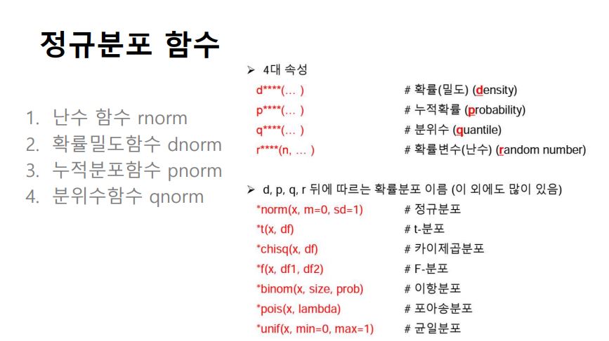 최빈값 table() 함수로 빈도를 산출한 후, 빈도가 가장 많은 Factor를 반환하도록 한다. value ← table(data1) mode ← as.numeric(names(value[value == max(value)])) mode R에는 4가지 정규분포와 관련된 함수가 내장되어 있다. 난수 함수 rnorm 확률밀도함수 dnorm 누적분포함수 pnorm 분위수함수 qnorm 난수함수 정규분포함수의 변수에 해당하는 값을 임의로 생성해주는 함수이다. 디폴트(기본셋팅)은 ‘표준정규분포’이고, 평균과 표준편차를 설정해줄 수 있다. 확률밀도함수 확률밀도함수는 확률밀도함수의 함수값을 구해줍니다. 확률밀도함수 이기 때문에 값 자체가 확률을 의미하지는 않습니다. 디폴트 평균이 0이므로 최대값은 0에서 발생한다...