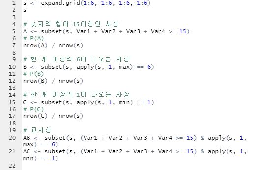 표본공간과 사상 표본공간 : 확률실험을 실시하여 나타낼 수 있는 모든 결과의 집합 예시 : 주사위 한 개를 던지는 확률 실험에서의 표본공간은 S = {1, 2, 3, 4, 5, 6} 사상 : 표본공간을 구성하고 있는 원소 중에서 관심의 대상이 되는 원소들의 집합 (표본공간의 부분집합) 예시 : 주사위를 던지는 실험에서 “홀수가 나오는 사상”을 A 라고 하면 A = {1, 3, 5} 조건부 확률 확률 : 어떤 사상이 발생할 수 있는 가능성을 수치로 나타낸 것 조건부 확률 : 어떤 사상 B가 발생했다는 조건 하에서 또 다른 사상 A가 발생할 확률 P(B|A) : 사건 A가 일어났을 때 B가 일어날 확률 P(A∩B) : A와 B가 동시에 일어날 확률 expand.grid( ) : 주어진 벡터들로부터 가능한 모..
