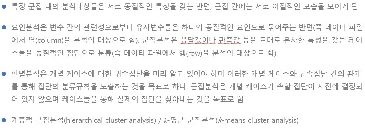 지도학습 VS 비지도 학습지도학습의 특징으로는 "미래를 예측한다" 이다. 여러 X 독립변수들을 가지고 하나의 종속 변수 Y를 예측하는 모형을 모형화시킨다.비지도학습의 큰 특징으로는 "분류" 이다. 비지도학습에는 군집 분석, 요인 분석, 신뢰성 분석이 있고 크게 보면 군집분석과 요인+신뢰성 분석이다. 군집분석은 사람들을 분류하여 각 군집의 특성을 파악하고, 특성에 맞는 계획을 수립한다. 요인분석은 변수(요인, Factor)들을 분류하여 유사한 변수들끼리 묶는다. 10개 변수로 분석할 일을 3개의 변수로 단순화할 수 있다. Q 왜 군집분석에는 신뢰성 검사를 하지 않을까? A 계층적 군집분석을 예시로, 군집분석은 단계적으로 진행이 되기 때문에, 신뢰성 검사가 따로 필요하지 않다. ★ 신뢰성 분석은 시험..