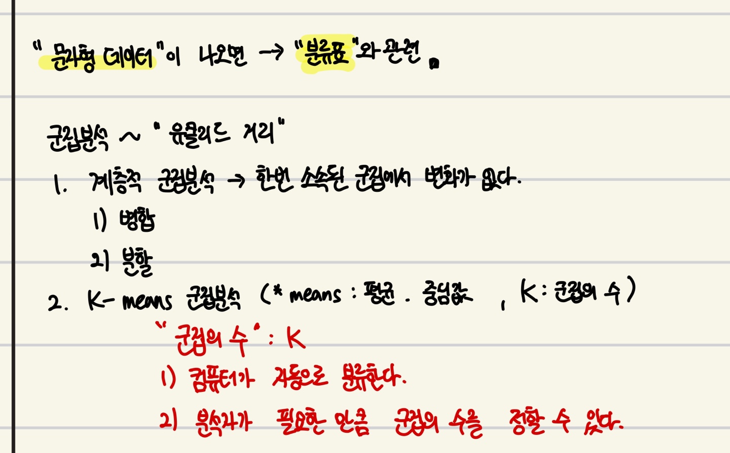 - 군집(cluster) : 유사한 특징을 지니거나 유사한 답변을 한 케이스들을 동일한 집단으로 분류하며 이러한 집단을 군집