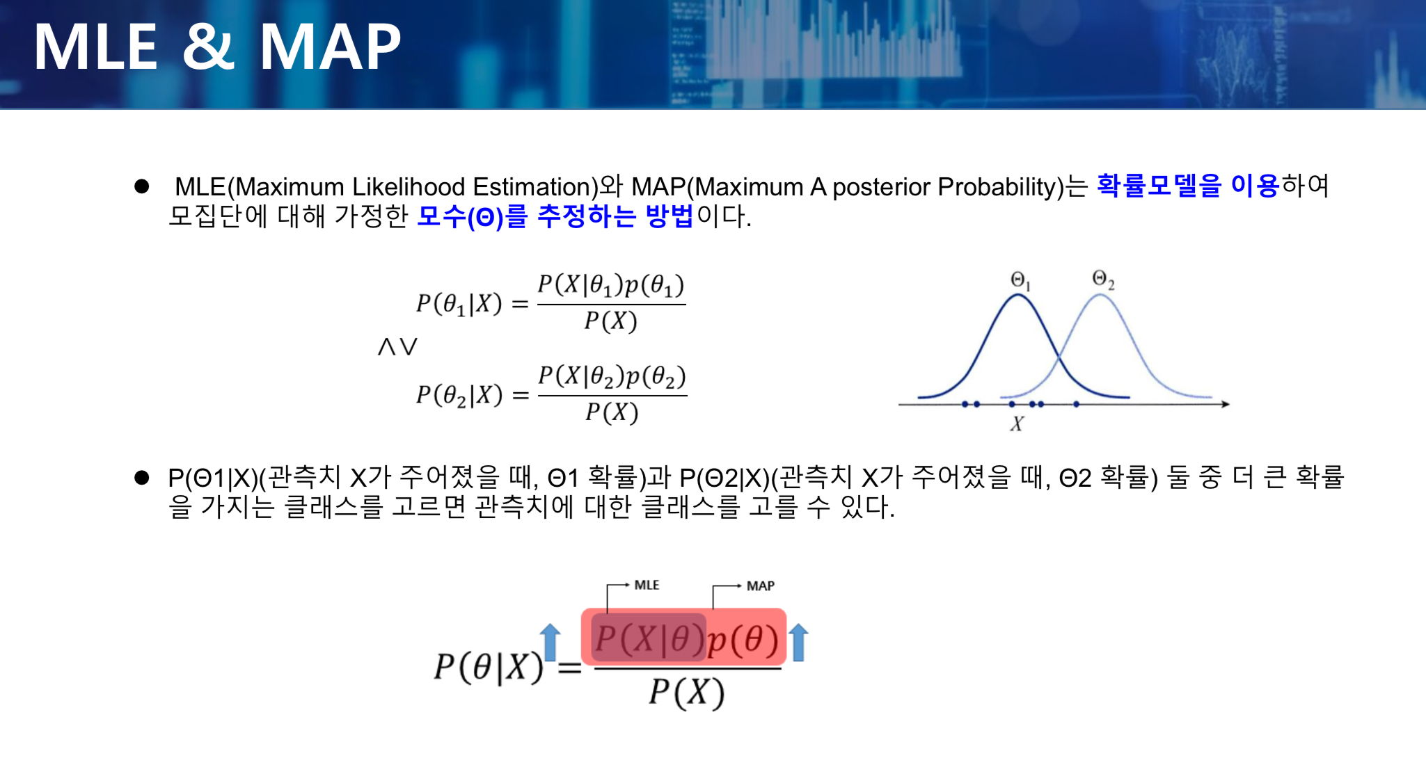 - P(X | Q) * P(Q) 전체를 최대로 하는 것이 곧 사후확률을 최대화하는 것이며, 이 방법을 MAP이라고 한다.