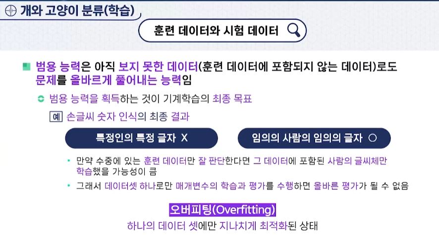 - 머신러닝 (기계학습 문제)에서는 데이터를 훈련 데이터와 테스트 데이터로 나눠 학습과 실험을 수행하는 것이 일반적이다.