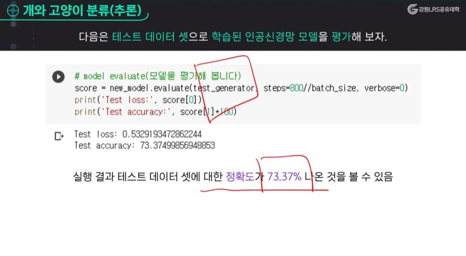 구글 코랩을 활용하여 학습된 모델을 이용한 개와 고양이 분류 모델 추론을 따라할 수 있다.