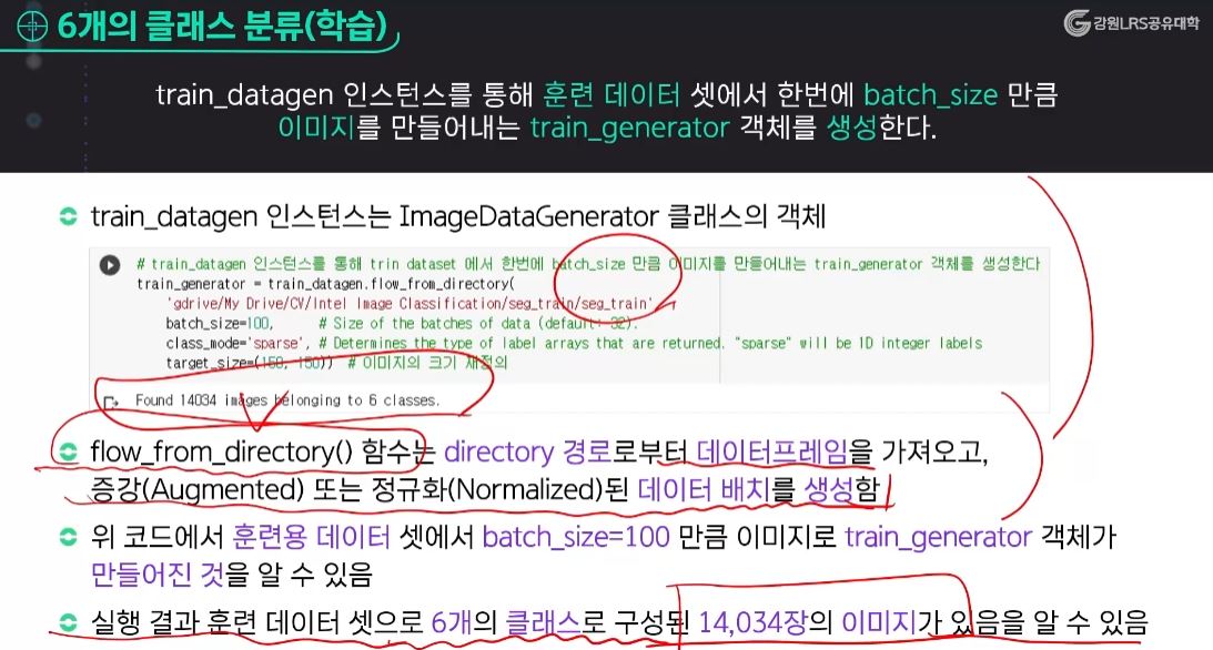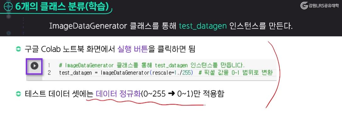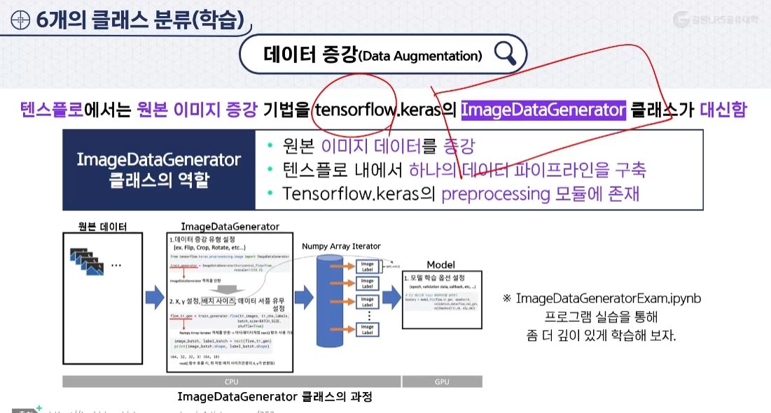 - 그러한 복잡성을 낮추기 위해서 텐서플로와 같은 프레임워크에서는 ImageDataGenerator라고 하는 클래스를 이용해서 데이터를 만들어 주는 것이다. 이렇게 만들어 줌으로써 실제로 학습이 병렬로 처리되고 결과적으로 짧은 시간에 원하는 결과를 만들어 낼 수 있도록 한다.