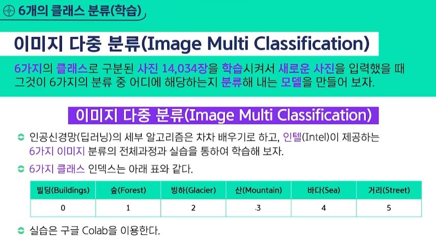 다중 이미지 분류에 대해 이해하고, 구글 코랩을 활용한 6개의 클래스 분류 모델 학습을 따라할 수 있다.
