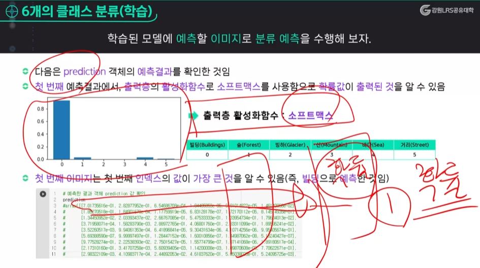 → 첫 번째, 모델이 예측한 것 중에 첫 번째를 끄집어 내서 데이터를 보자. 데이터의 값이 실수의 값인데 6개의 값을 다 더하면 1이 된다. 6개의 데이터는 확률이라고 하는 것이다. 왜 확률로 나오느냐?
