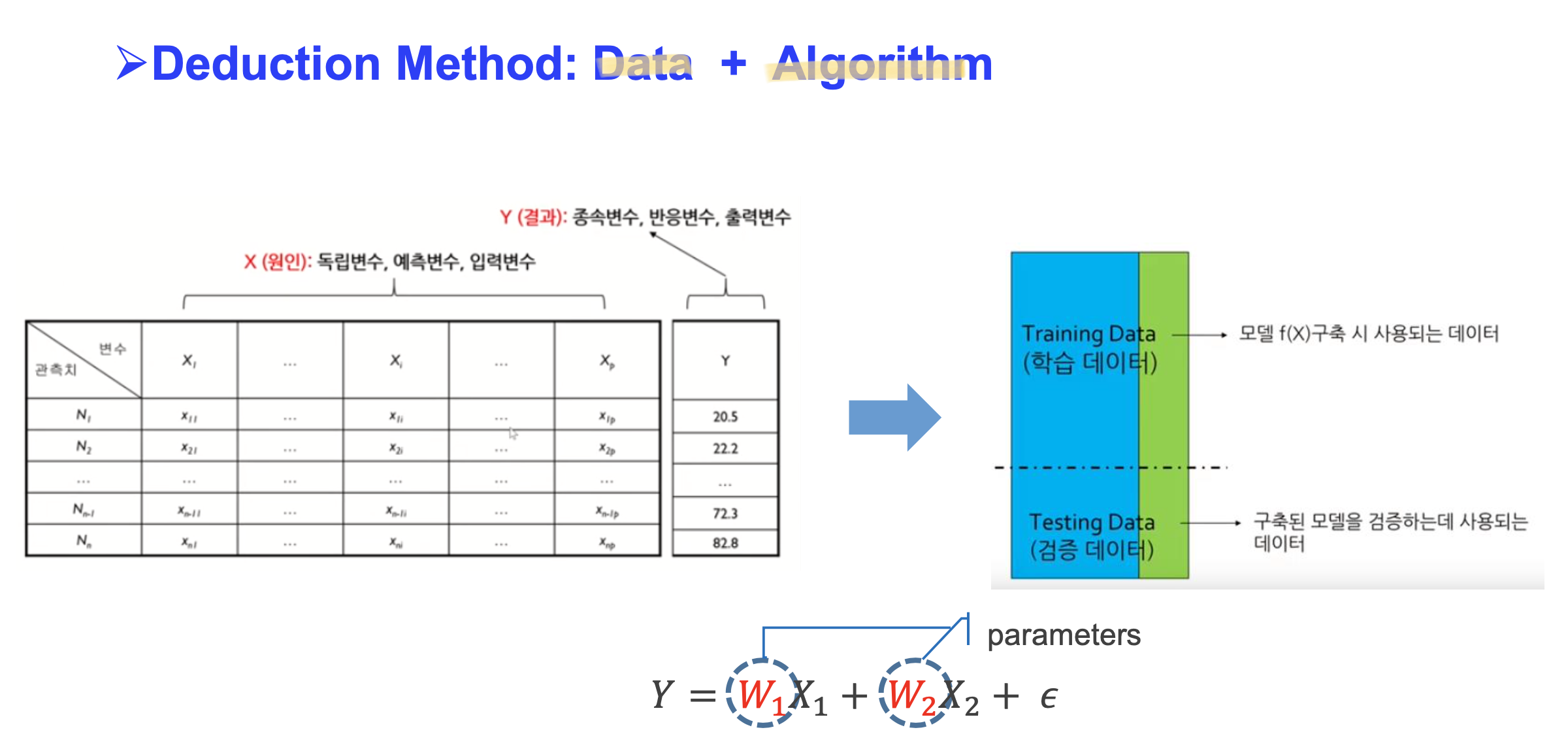 - 귀납적 추론 : 경험이나 관측으로부터 시작하여 결론에 도달한다. 데이터를 중심으로 하며, 머신러닝에 쓰인다.
