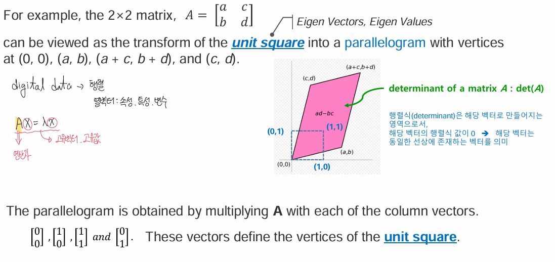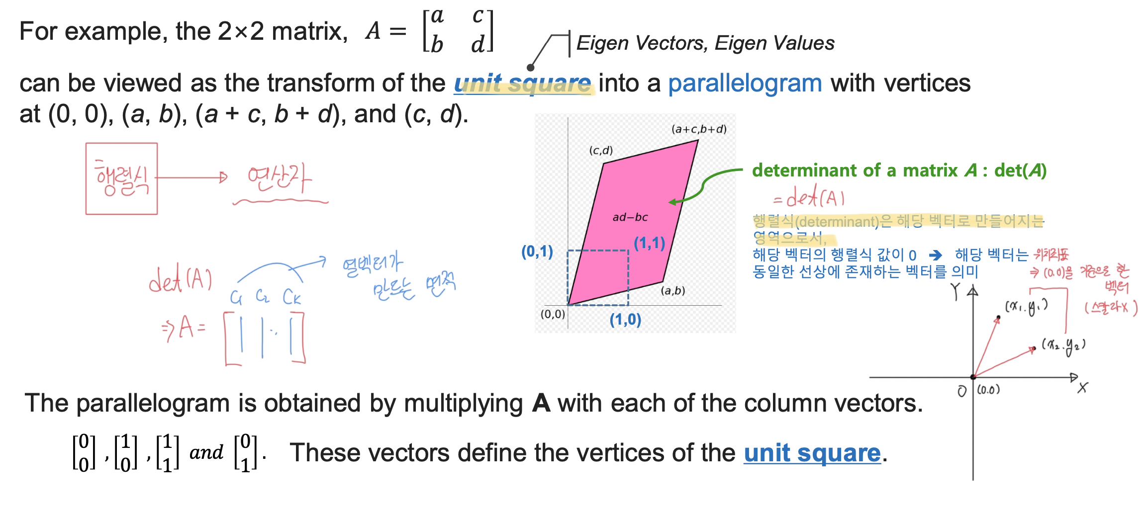 - det(A) : 선형모델의 행렬식 A로 인한 영역의 특징 (확대 or 축소)을 파악할 수 있으며, 0이 아니라는 것은 행렬식을 구성하는 모든 열(행)벡터가 서로 독립임을 의미한다.