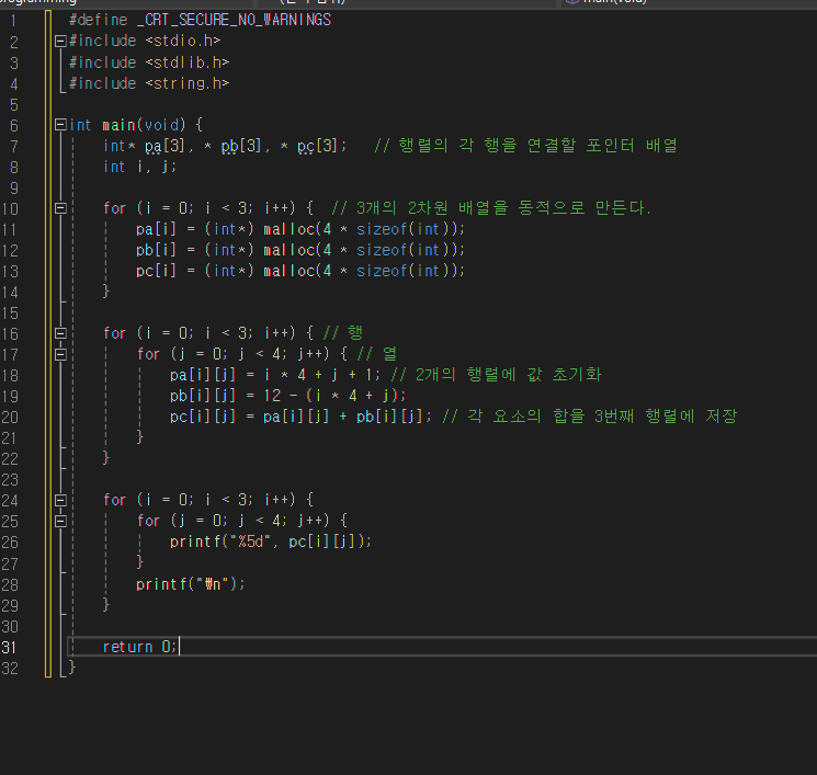 다음과 같이 행렬의 합을 구하는 프로그램을 동적 할당을 사용하여 작성해보자