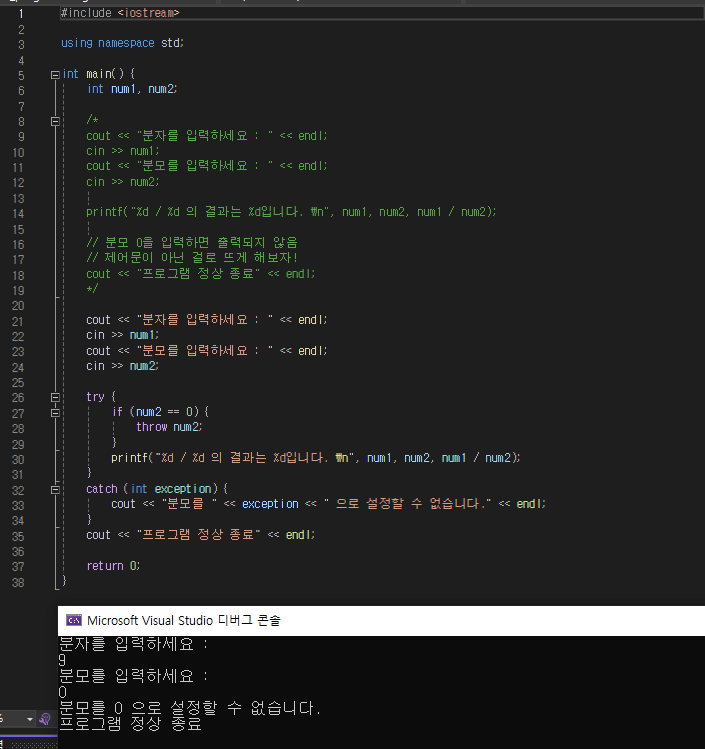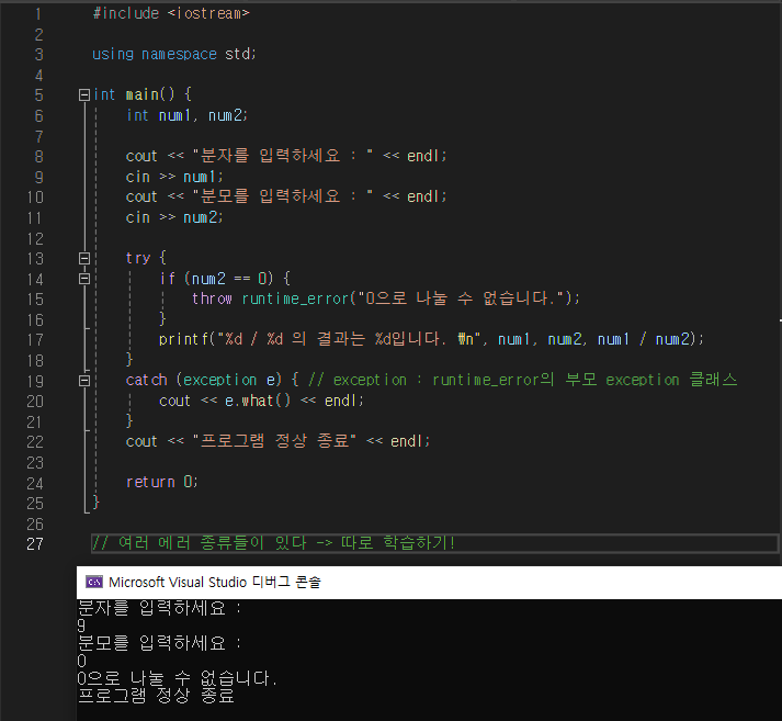 - catch : throw에서 던진 변수를 인자로 받아서 catch 블록 내부에 작성한 예외처리 실행