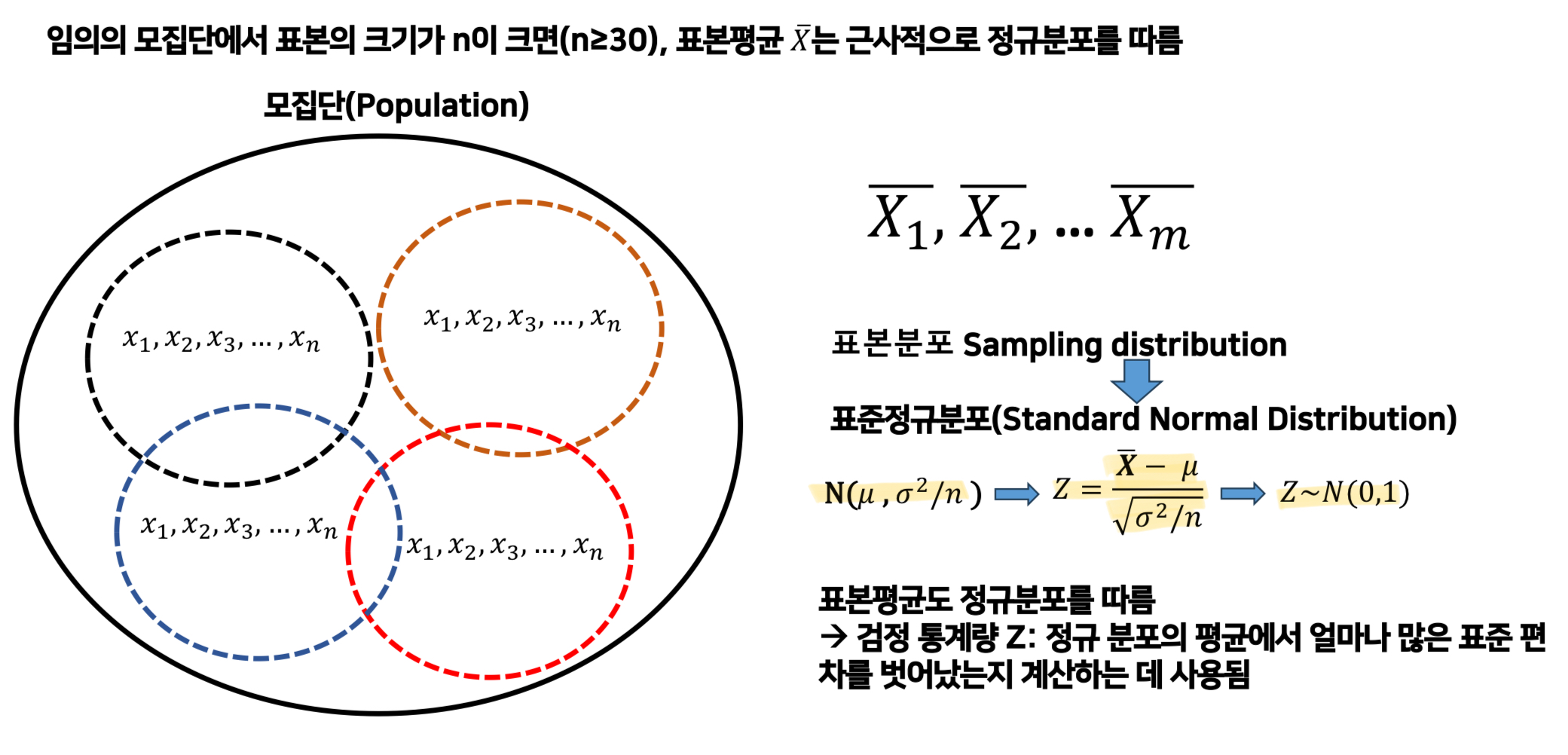 - [ 중심 극한의 정리 ] : 표본의 크기가 커질수록 모집단의 분포와 상관없이 정규분포에 가까워진다는 것을 의미한다.