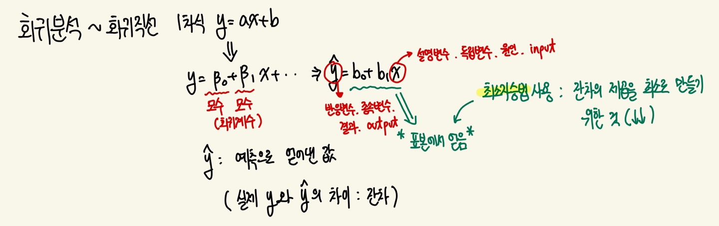 - 지도학습 1) 단순선형회귀 : 독립변수 1개